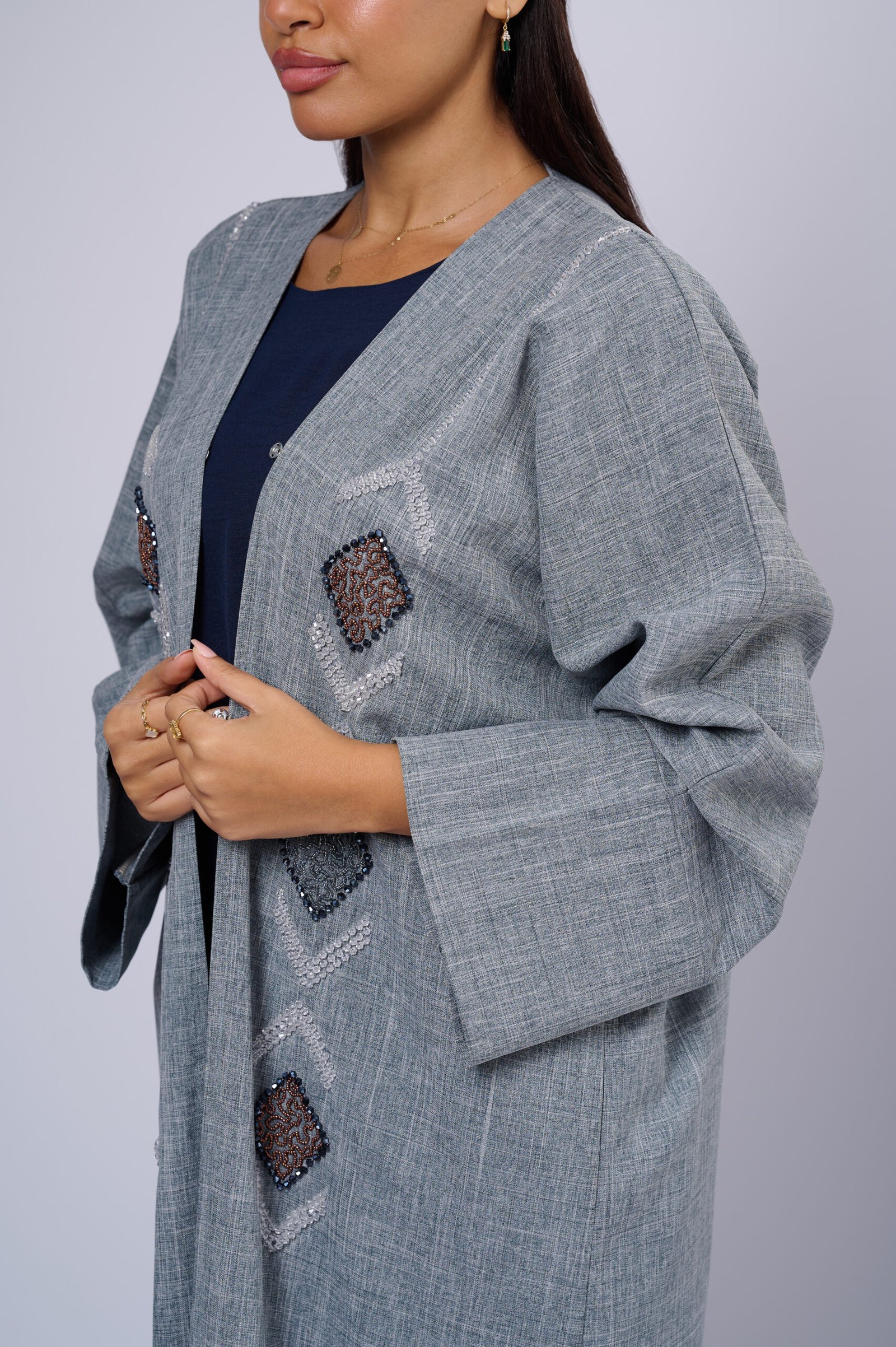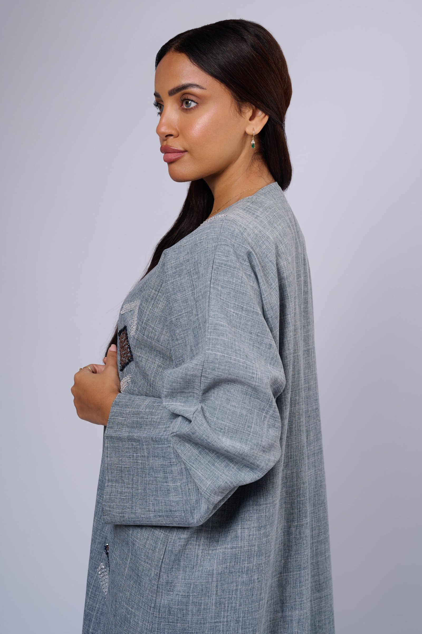 Crafted from high-quality linen, it offers a breathable, lightweight feel and a softly structured silhouette perfect for all seasons. Delicate hand-applied beadwork adds a touch of subtle shimmer, enhancing the abaya’s effortless sophistication.