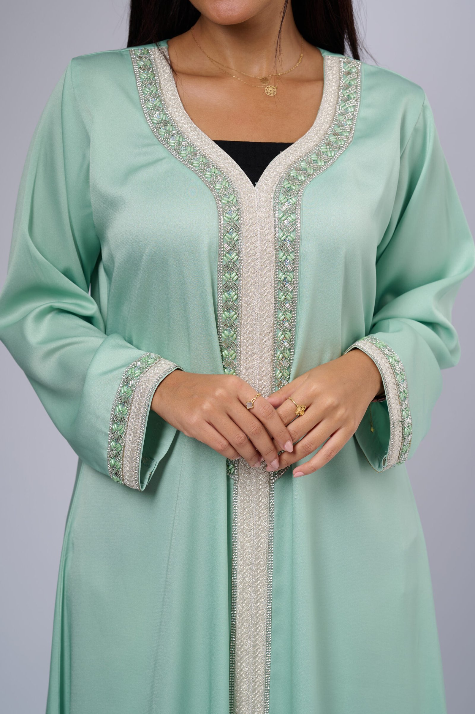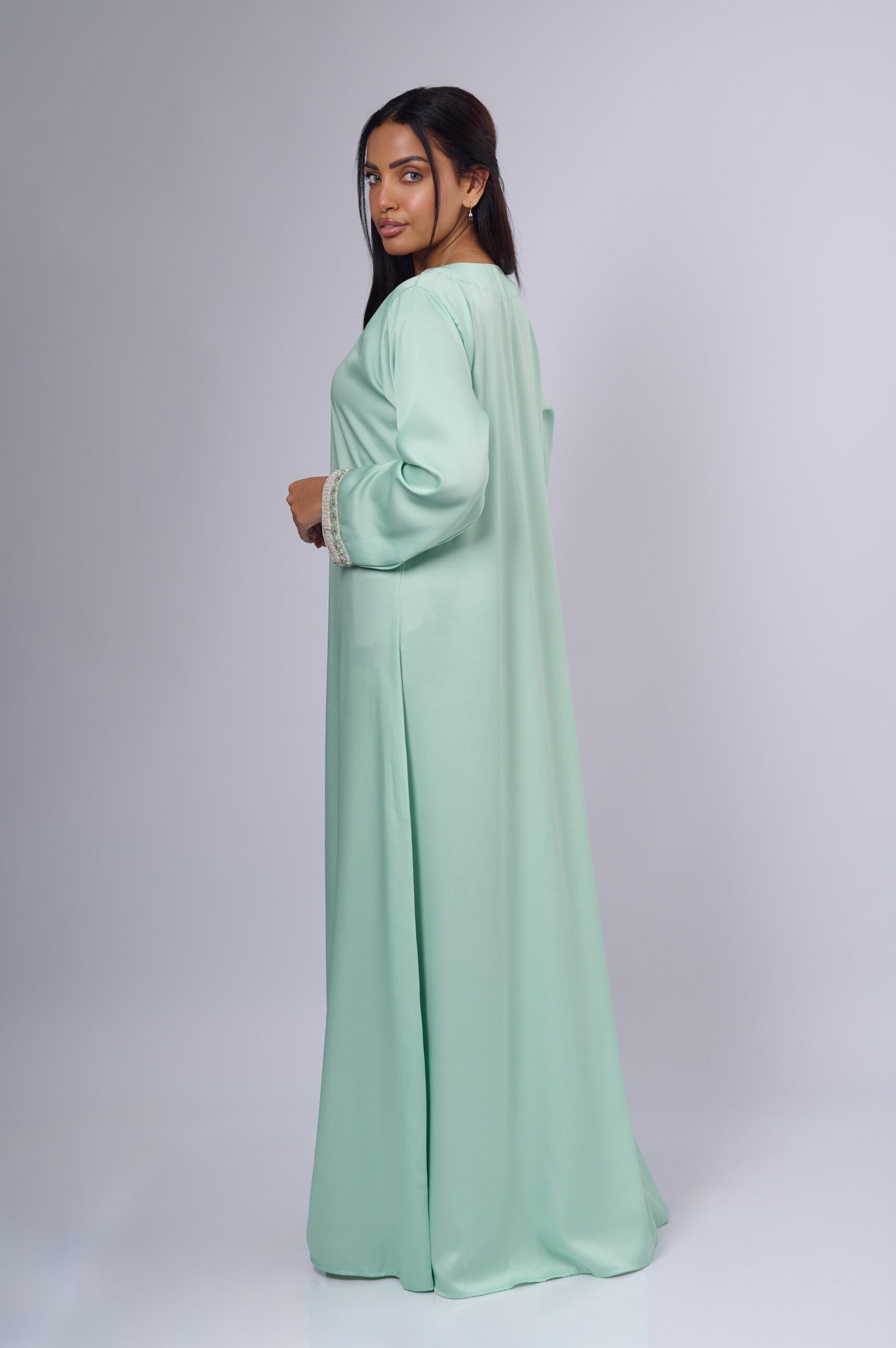 Step into refined sophistication with our Mint Elegance Satin Crepe Abaya, designed to capture timeless beauty and grace. Crafted from luxurious satin crepe fabric, this abaya offers a silky-smooth texture with a graceful drape, ensuring comfort and elegance all day long.