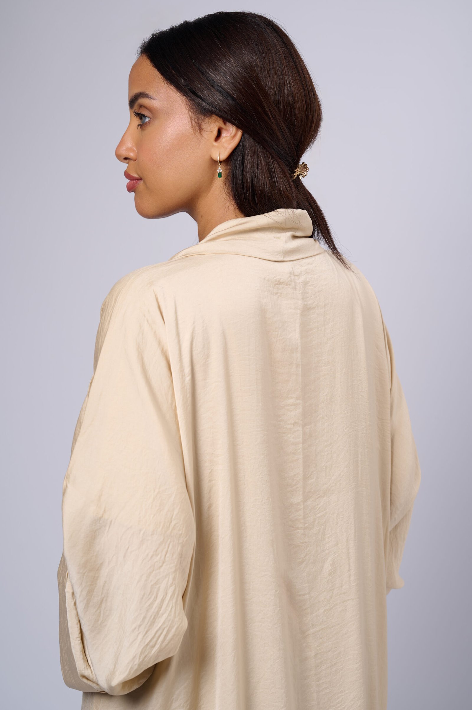 Crafted from high-quality soft polyester fabric, it offers a smooth, lightweight feel with a subtle texture that drapes beautifully. The soft beige tone exudes warmth and versatility, making it perfect for both casual outings and refined occasions.