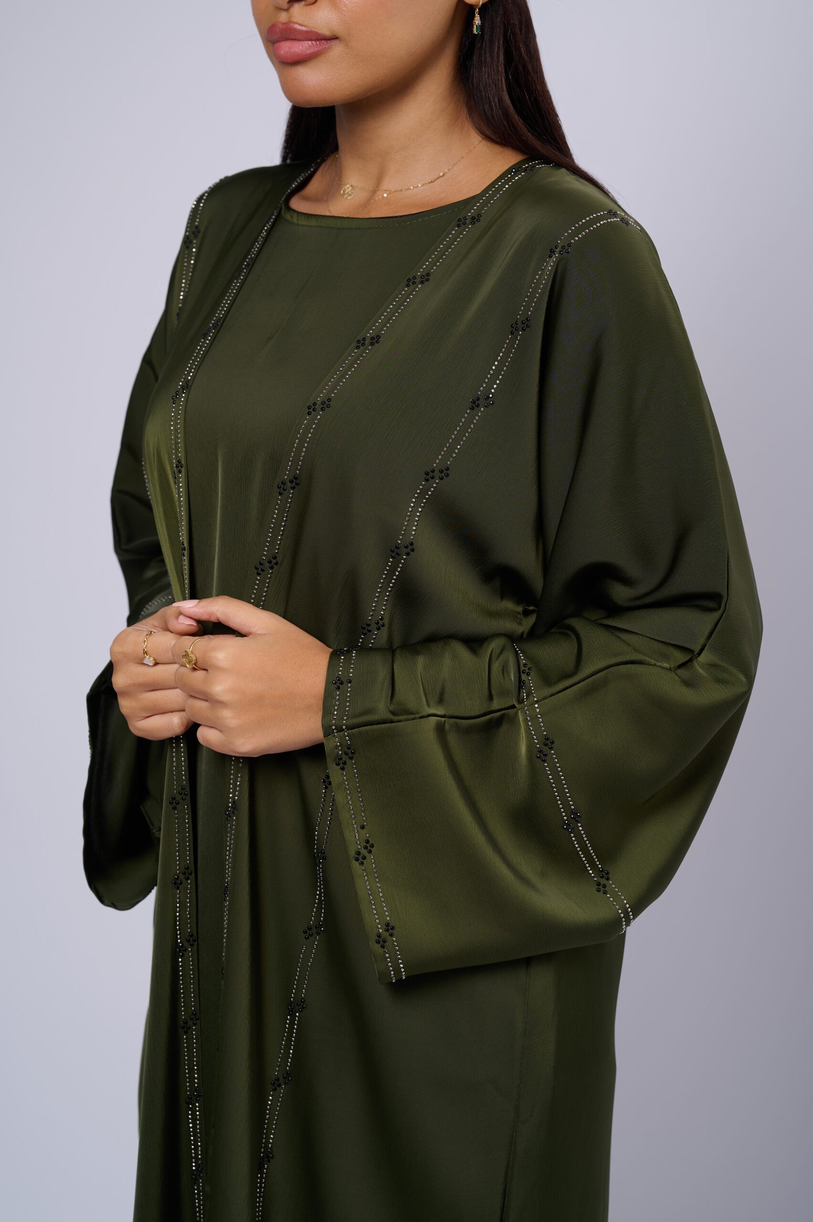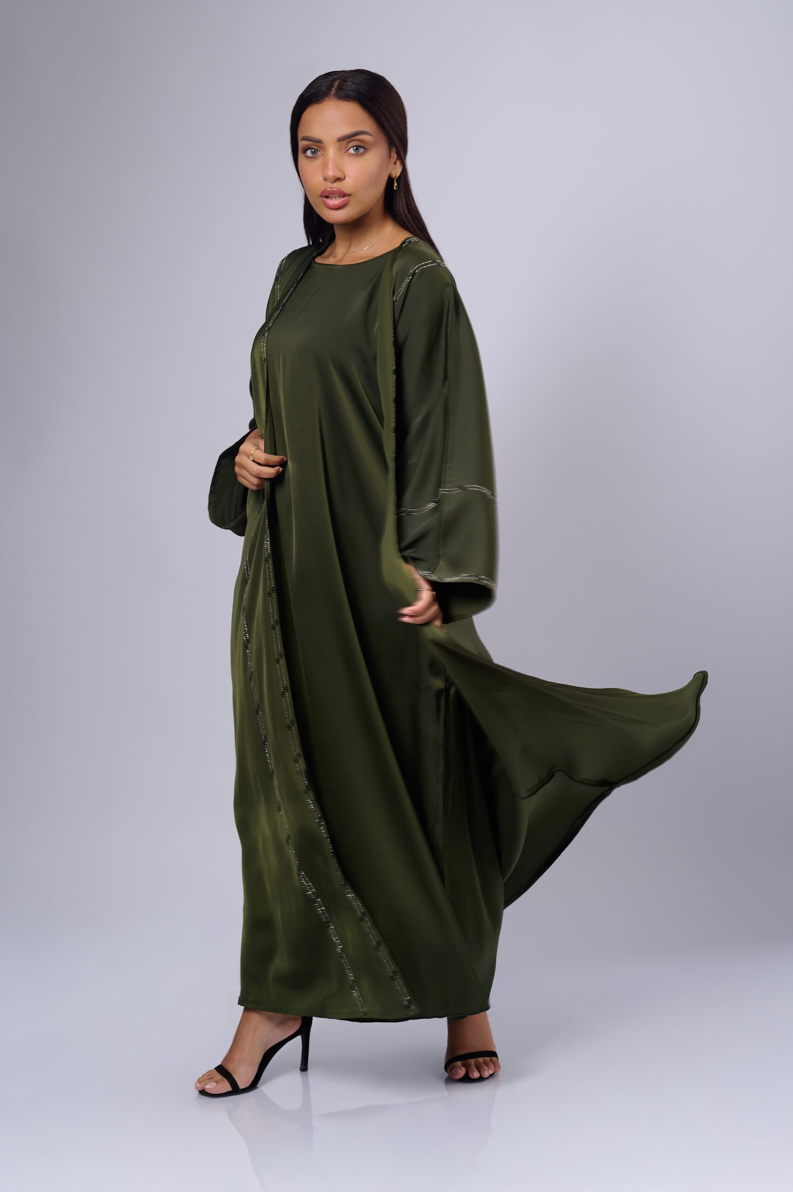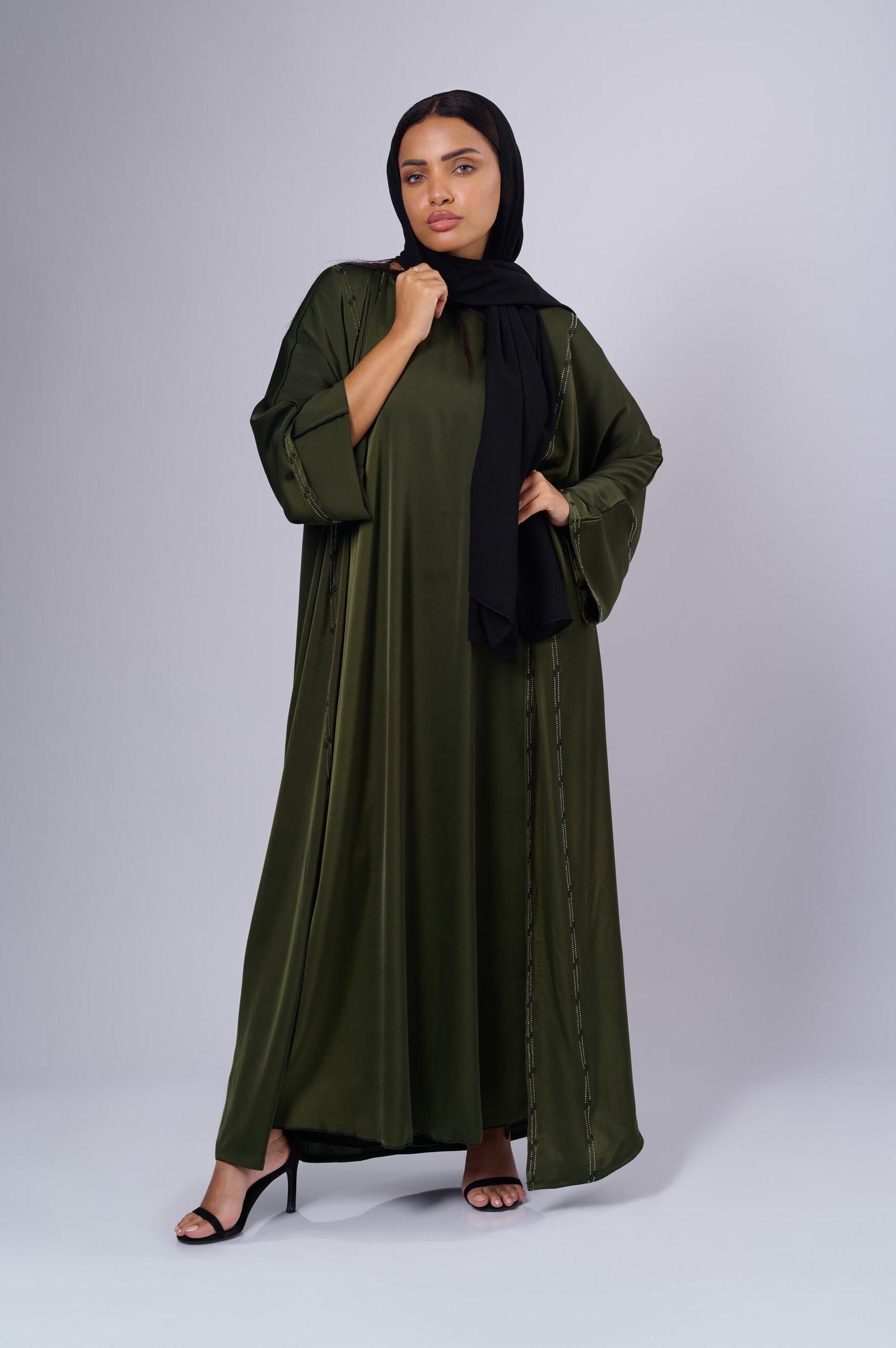 Embody timeless elegance with this exquisite khaki green abaya, meticulously tailored from premium satin crepe that glides effortlessly with every movement. The fabric’s soft sheen captures the light beautifully, enhancing the abaya’s rich hue and fluid silhouette.