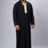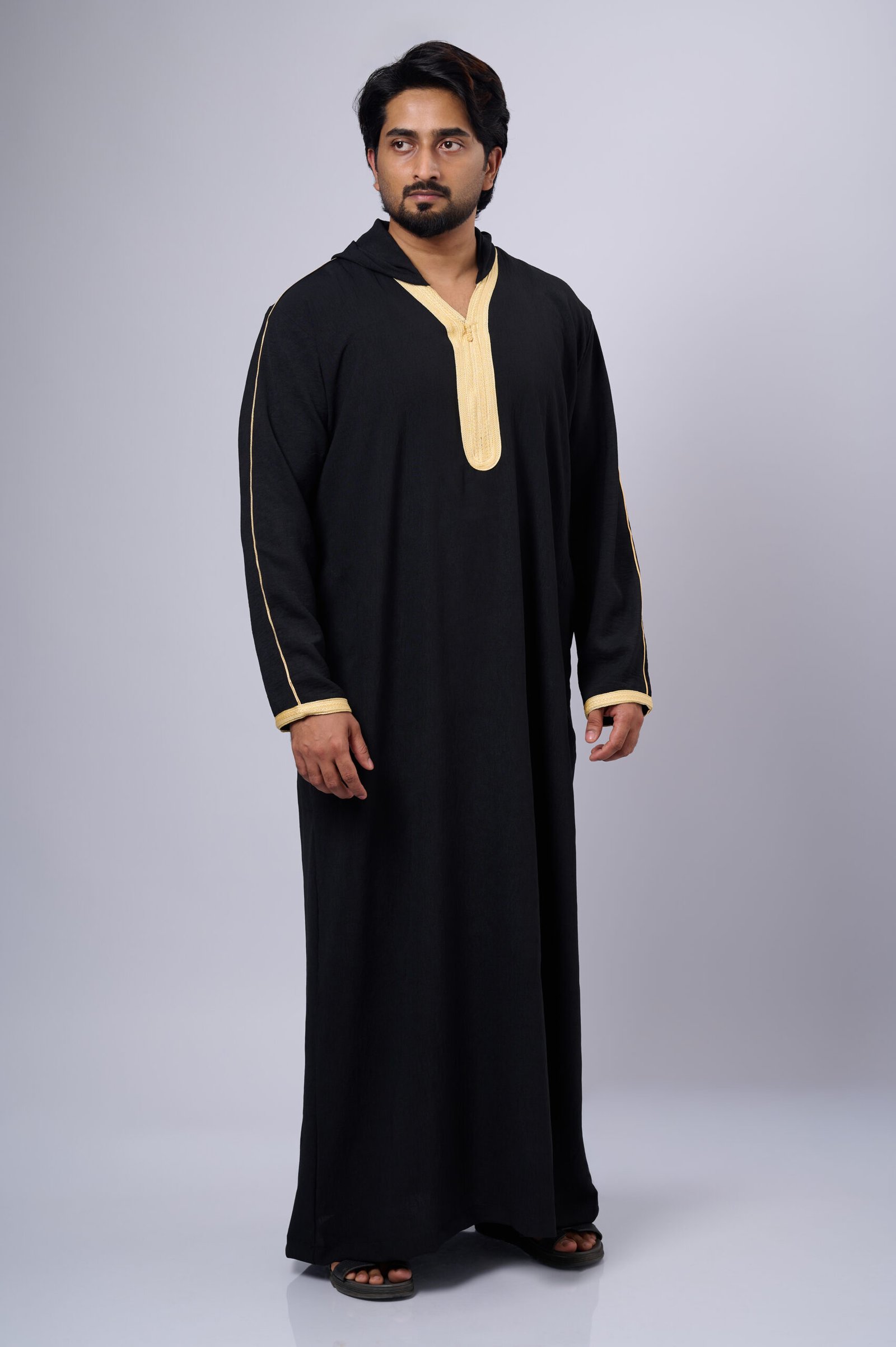 Distinctive and elegant, this Hooded Moroccan Thobe combines rich black fabric with subtle beige accents for a bold yet refined look.