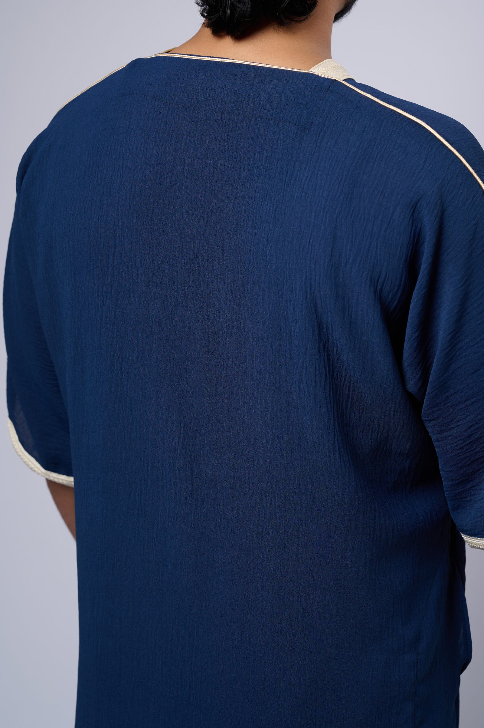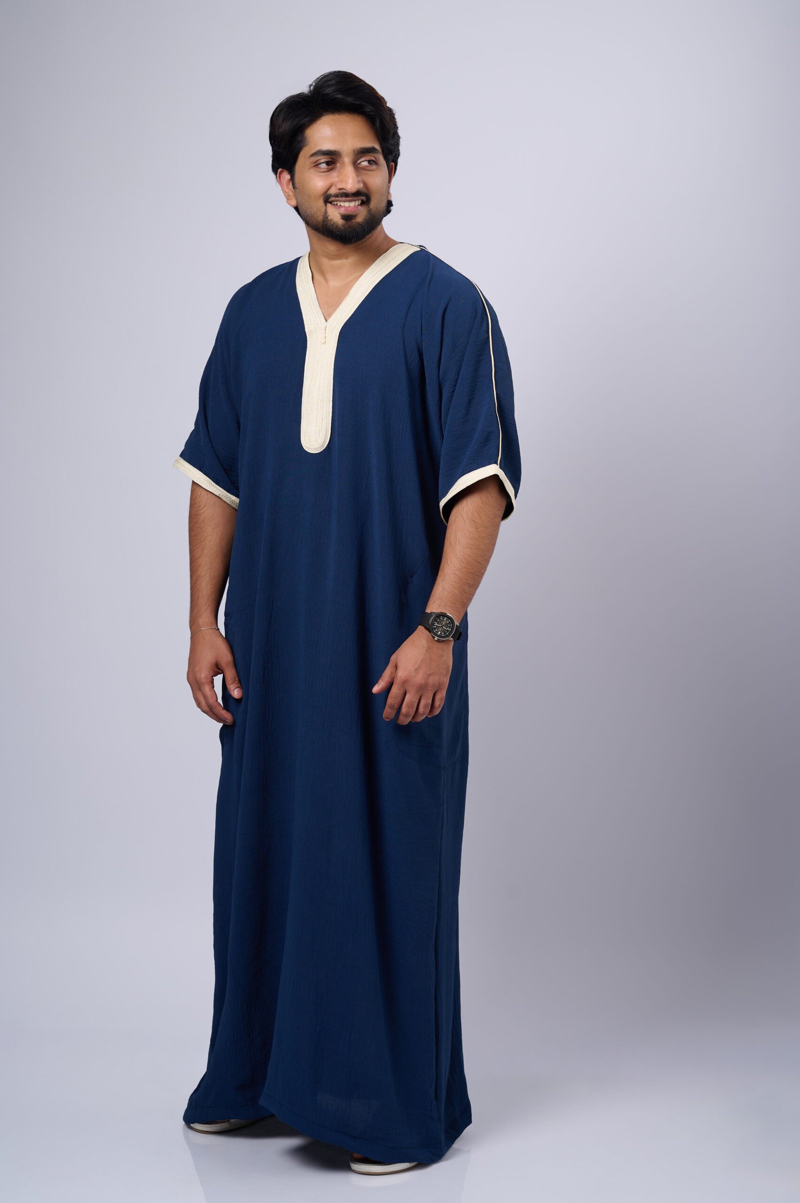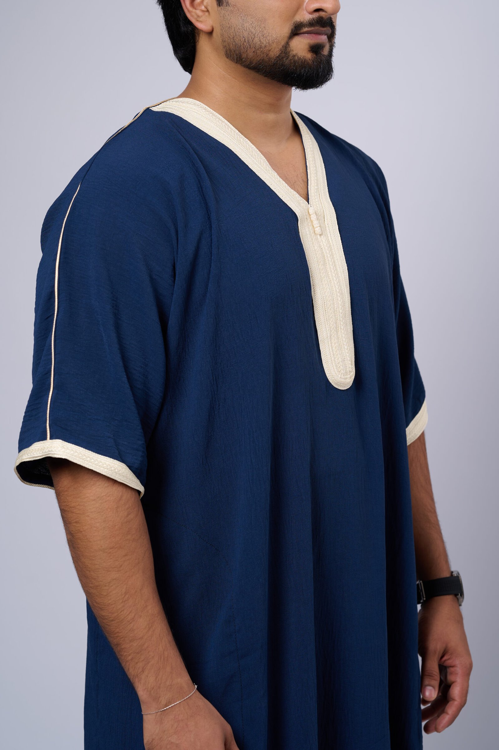 Elegant and contemporary, this Moroccan Thobe features a deep navy blue base highlighted with crisp white embroidery for a refined contrast.
